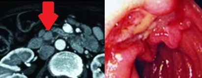 The area of gastric invasion by the expanding pancreatic carcinoma being the cause of intermittent bleeding (Courtesy Dr. V. Penopoulos)